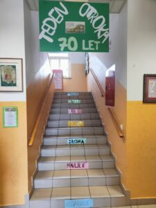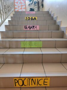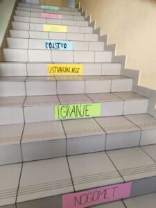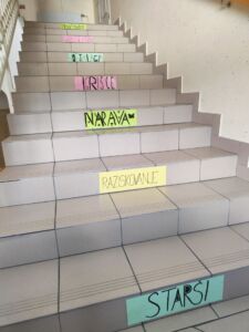 Poseben izziv je bil iskanje besed, ki nas spominjajo na otroštvo. Te besede smo nato napisali na barvne liste in jih nalepili na stopnice v naši šoli. Tako so naše stopnice postale pravi sprehod po otroških spominih – besede, kot so igra, prijatelji, pravljice in družina, krasijo naš hodnik in nas vsak dan spominjajo, kako dragoceno je naše otroštvo.