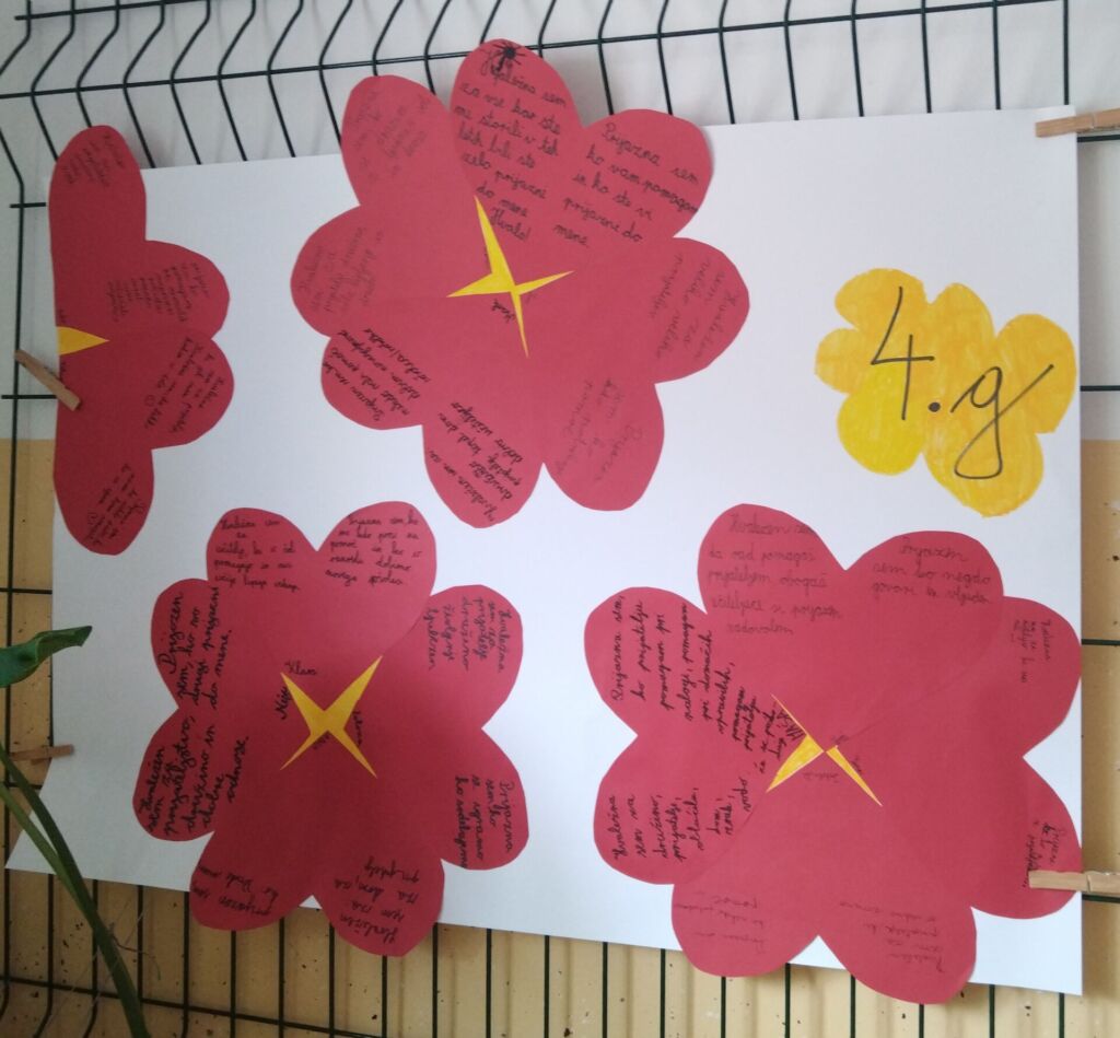 Prvošolci so povedali, za kaj so hvaležni in svoje misli predstavili v obliki sonca, drugošolci so naredili drevo prijaznih besed ter slikali roke, tretješolci so v obliko srčka napisali, za kaj so hvaležni. Četrtošolci so izdelali rožico prijaznih besed, petošolci pa vejo drevesa in v listke pa so zapisali svoje prijazne misli.