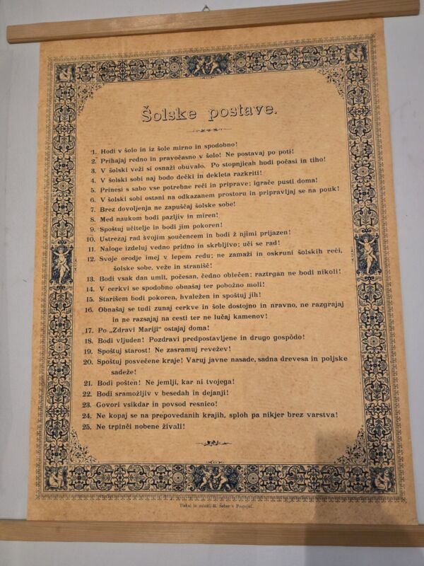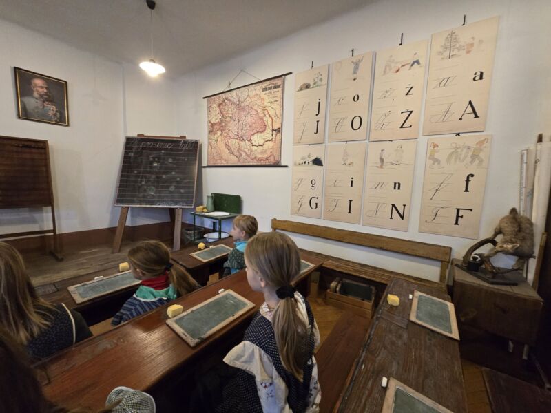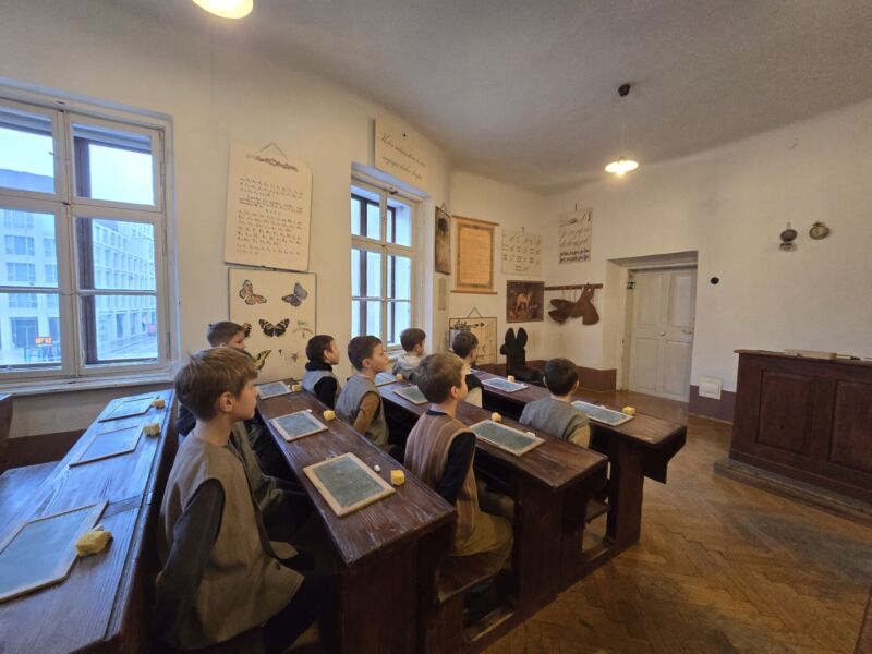 V sredo, 28. 1., smo si v Ljubljani ogledali muzejsko zbirko v Šolskem muzeju. Kustosinja nas je najprej popeljala skozi zgodovino šolstva od ranih začetkov šolanja do šolanja danes. Ogledali smo si različne stare torbe, peresnice, nalivnike, črnilnike, popisane zvezke in učbenike. V drugem delu našega obiska pa smo se udeležili šolske ure, tako kot so jo obiskovali učenci daljnega 28. prosinca leta 1900. Seveda se je bilo potrebno primerno tudi urediti za šolsko uro v oblačila, kot so bili oblečeni učenci nekoč. Kustosinja nas je pred prihodom gospodične učiteljice seznanila, kako se moramo obnašati v razredu, kako moramo sedeti ter kako moramo nagovarjati učiteljico, ko vstopi v razred. Seveda je z nekaj vaje tudi to šlo.